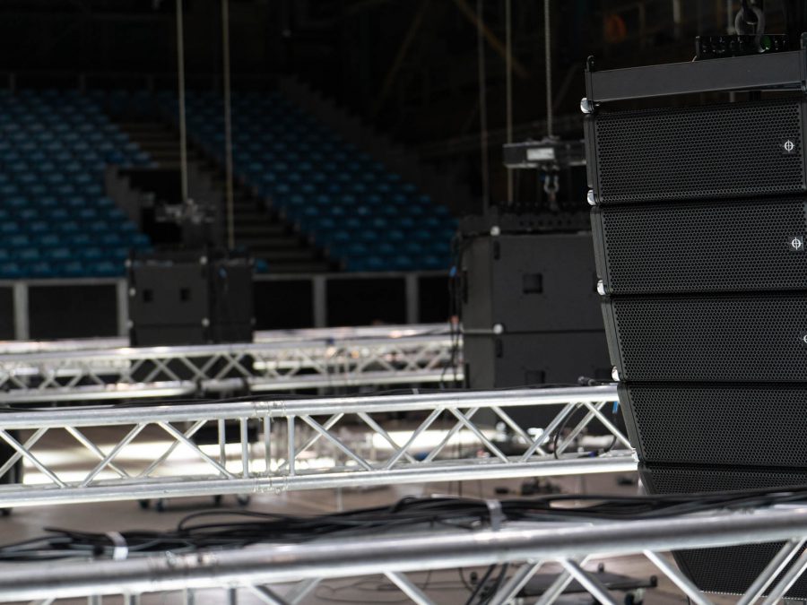 在哥廷根Lokhalle多功能体育馆布置的整套CODA系统包括:覆盖主看台的24只ViRAY,覆盖球迷看台的16只N-RAY,8只传感器控制超低频扬声器SCV-F(4 x 2吊装),以及2只多功能扬声器G712-PRO,整套系统由5套4通道巡演机柜功放套装LINUS M-RACK进行驱动。