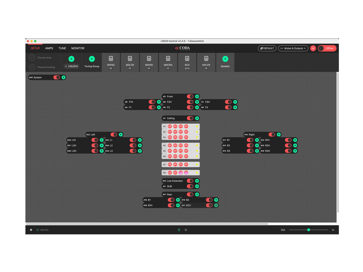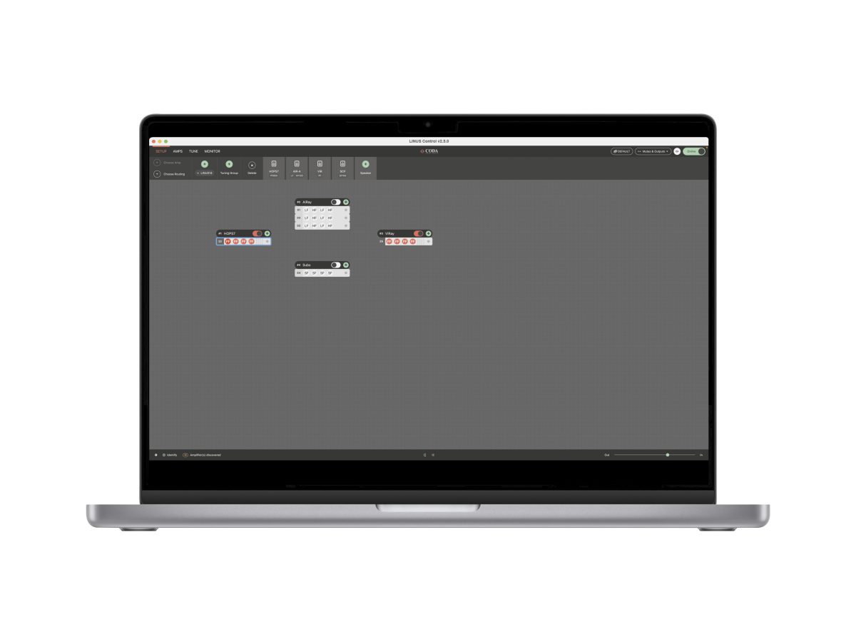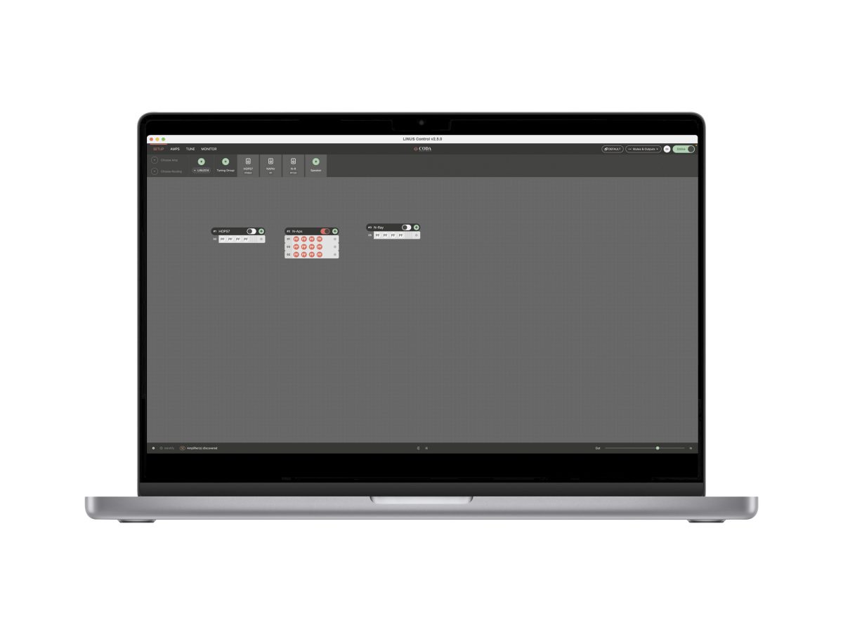 LINUS Control应用程序为控制与监视CODA LINUS功放平台提供了一个可靠而坚固的方法。LINUS Control兼容Mac OSX与Windows操作系统,支持平板及桌面环境。LINUS Control应用程序捆绑了设备固件,扬声器文件,控制逻辑以及一个第三方UDP控制协议用于第三方设备在离线状态下远程控制LINUS功放。