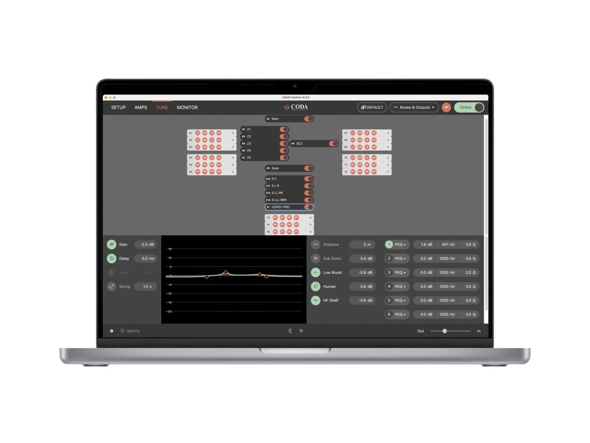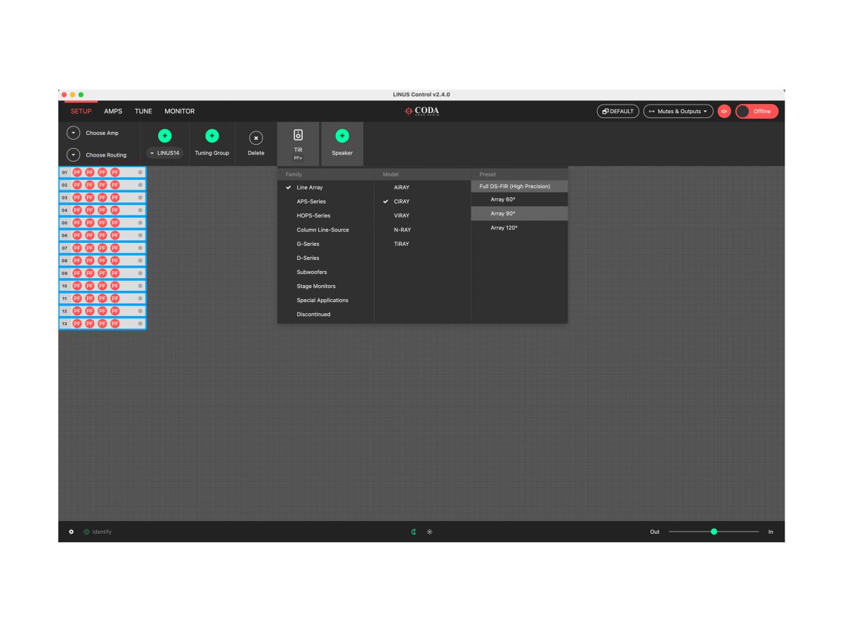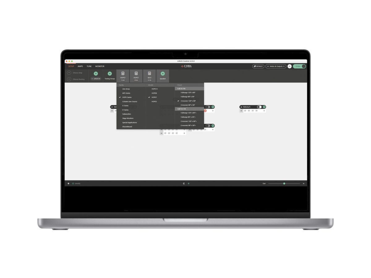 LINUS Control应用程序为控制与监视CODA LINUS功放平台提供了一个可靠而坚固的方法。LINUS Control兼容Mac OSX与Windows操作系统,支持平板及桌面环境。LINUS Control应用程序捆绑了设备固件,扬声器文件,控制逻辑以及一个第三方UDP控制协议用于第三方设备在离线状态下远程控制LINUS功放。