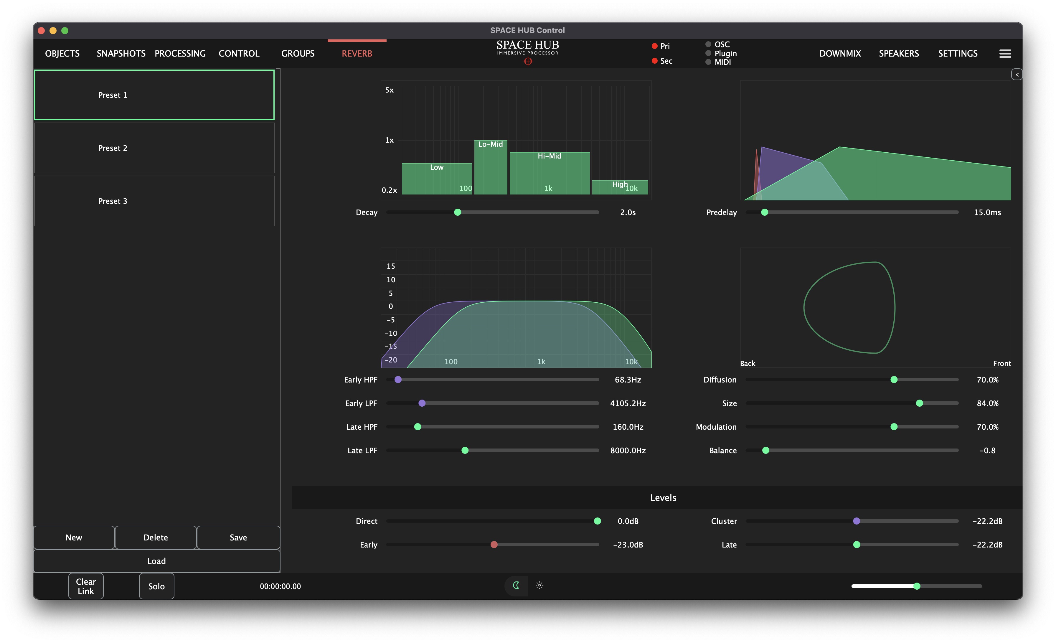 Decay Frequency Response 衰减时间可以在四个频段内进行调整,并在全局衰减时间上应用一个乘数