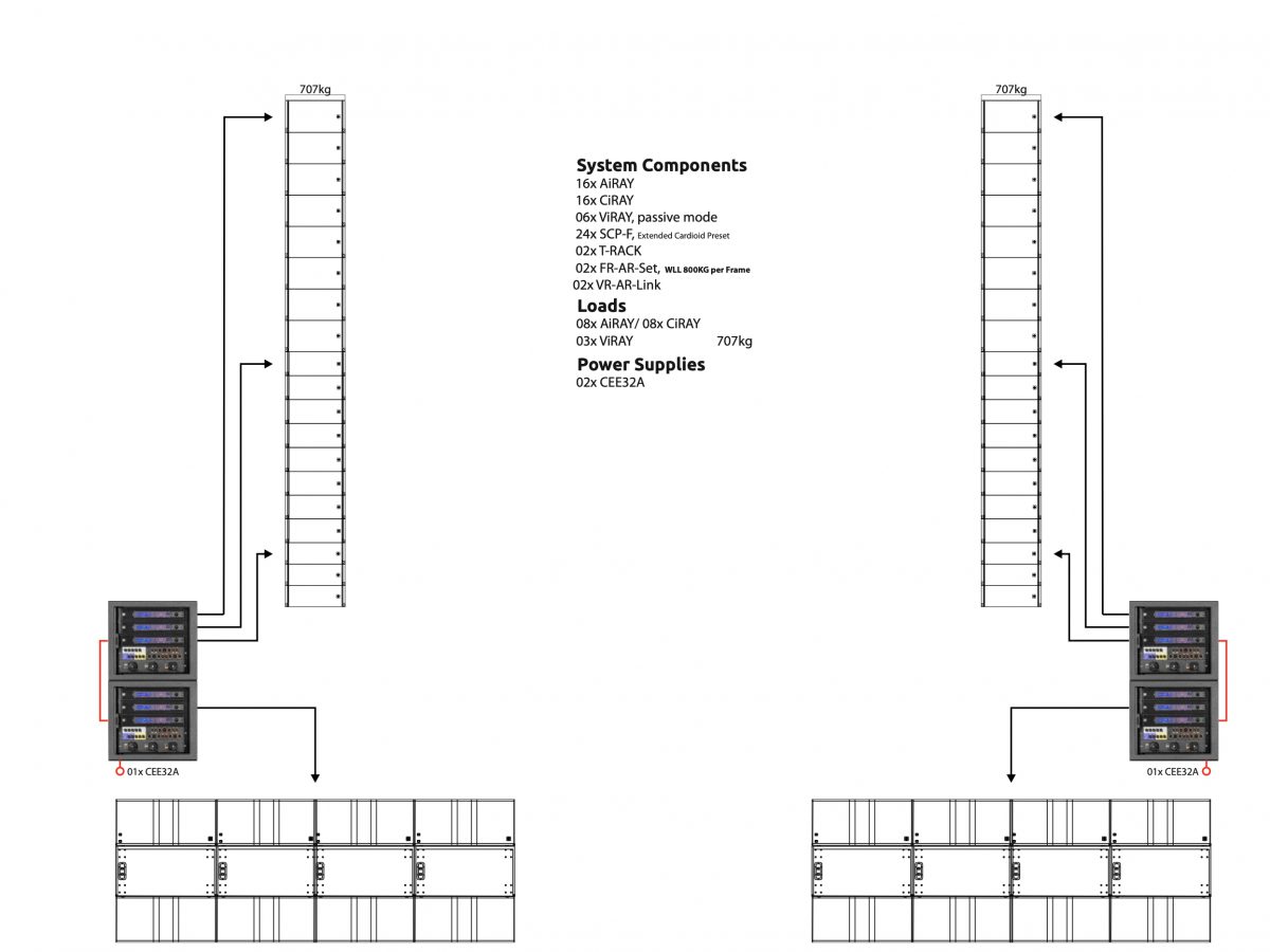 更极致的灵活应用,CiRAY可以与其它VCA家族产品搭配使用,包括ViRAY和AiRAY,加上SCP/SCP-F或SCV-F超低频或SC2-F低频扩展。SCP/SCP-F或SCV-F传感器控制超低频扬声器,可将系统整体性能进一步扩展,低至25 Hz。